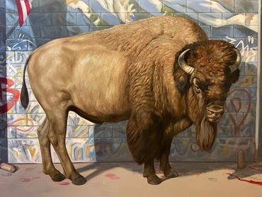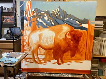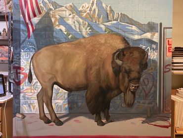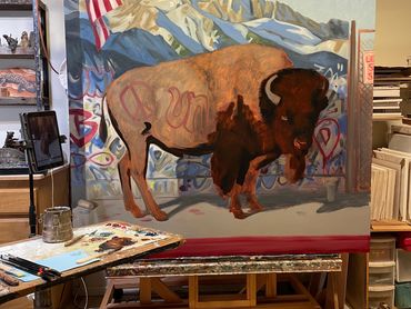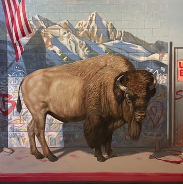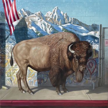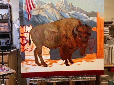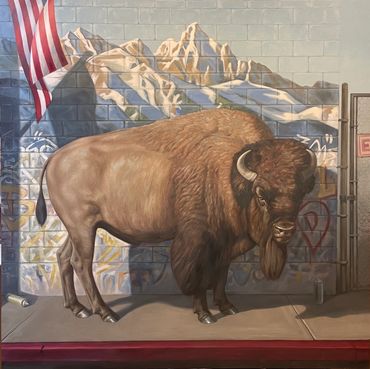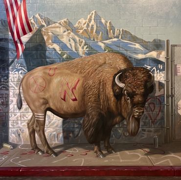 Freedom is the theme of my current painting which features a bison standing before the Grand Tetons. As we gaze upon this iconic American symbol, we're struck by the realization that the mountains are actually a mural painted on a block wall. A chainlink fence and city curb, once barriers to entry, now stand as a metaphor for the obstacles we face in pursuit of our dreams. The graffiti-covered wall and the bison's own fur tell a story of rebellion and self-expression, while the American flag casts a shadow of strength and resilience. The word 'BOUNDLESS' scrawled across the wall and the animal's coat serve as a reminder that our potential is limitless, and that we must strive to break free from the constraints that hold us back. This painting is an exploration of the American spirit, and the colors of the flag - red for bravery, white for innocence, and blue for vigilance, justice, and truth - serving as a poignant reminder of the values that we must uphold to truly prosper.